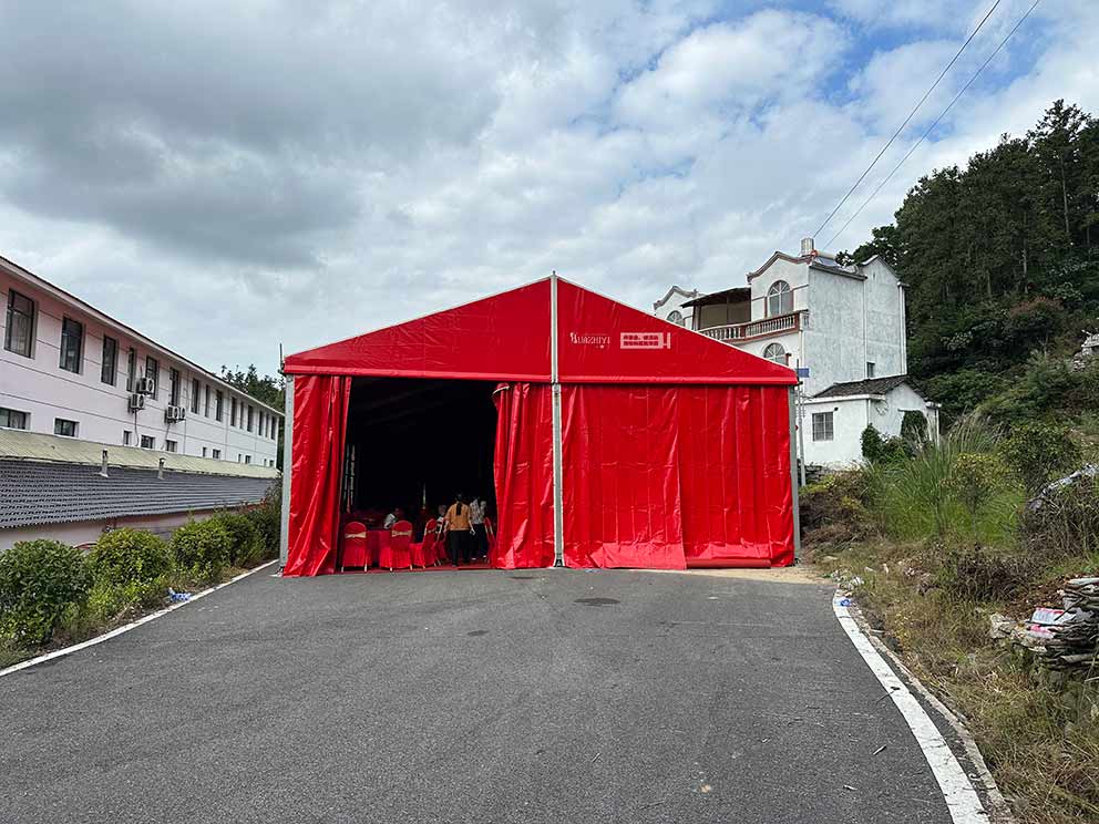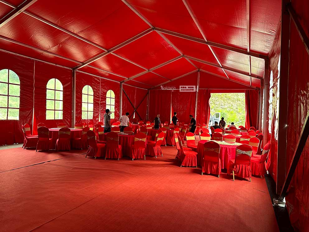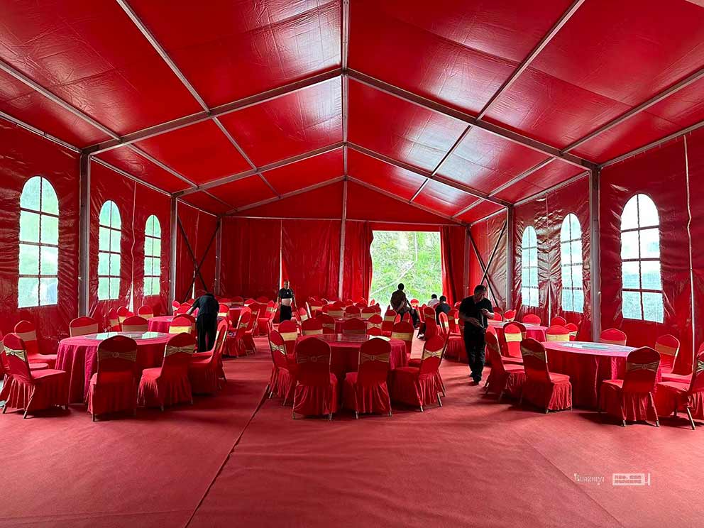 焦作篷房租賃為婚禮搭建的紅色篷房,是整個場地布置的核心亮點。篷房采用大跨度人字形設計,篷身選用高密度紅色PVC篷布,色澤濃郁飽滿,在陽光下呈現出熱烈而不失莊重的質感;篷布表面經過特殊處理,不僅防雨防曬,還能有效提升篷內亮度。