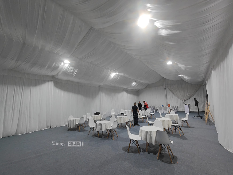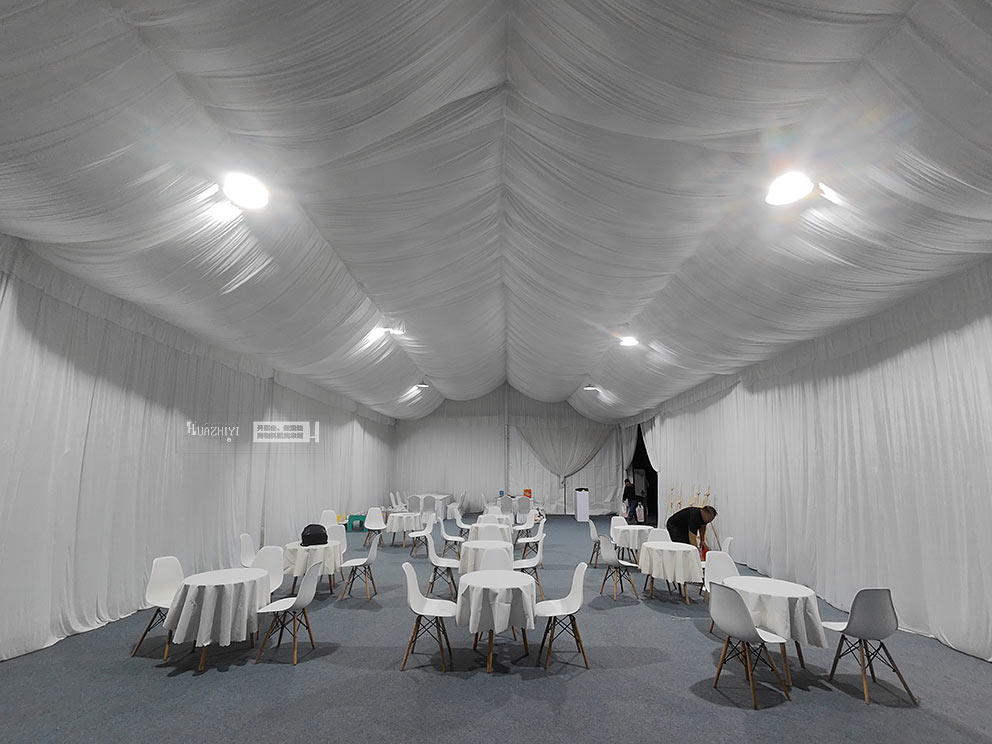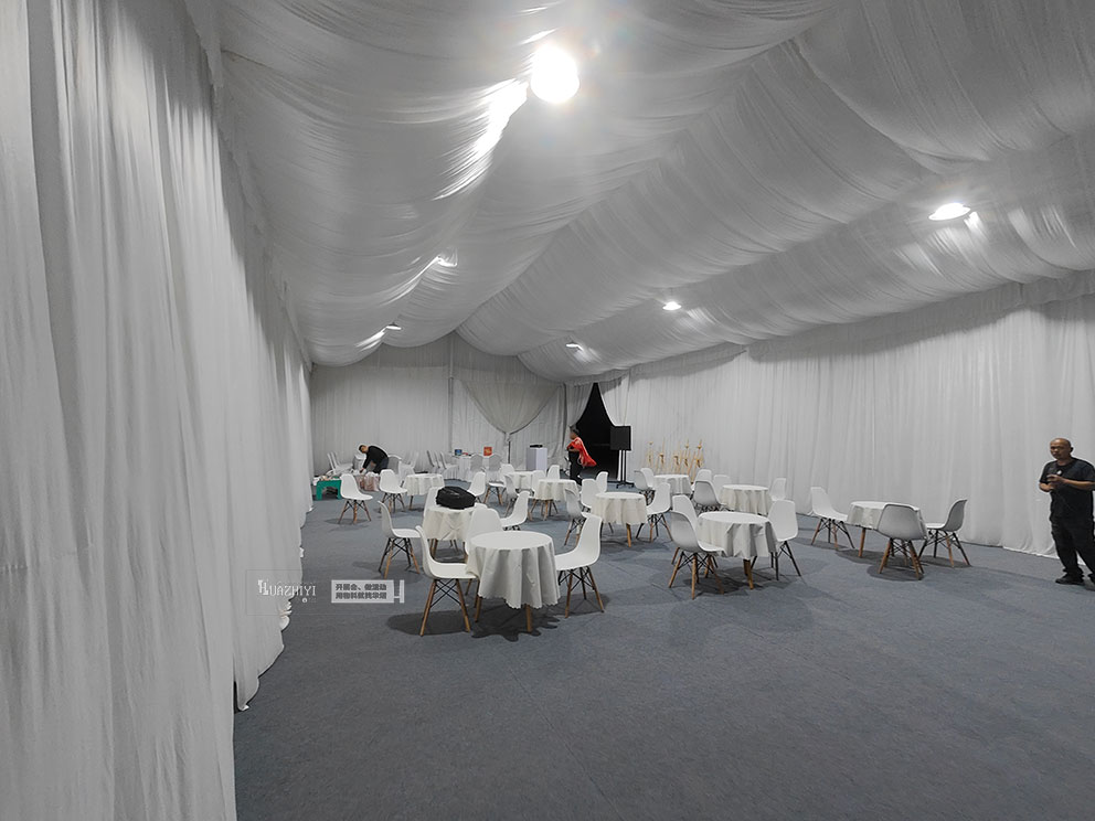 步入篷房,內(nèi)部布置更顯精致。頂部懸掛的米白色帷幔層層疊疊,既劃分出功能區(qū)域,又增添了空間的縱深感。休息區(qū)擺放著駐馬店篷房出租公司的白色伊姆斯桌椅,圓潤的椅身包裹著細(xì)膩面料,坐感柔軟卻不失支撐;桌面鋪著同色系桌布,原木色桌腿則注入自然暖意,中和了白色調(diào)的清冷,讓科技感十足的試駕會多了份居家般的松弛。