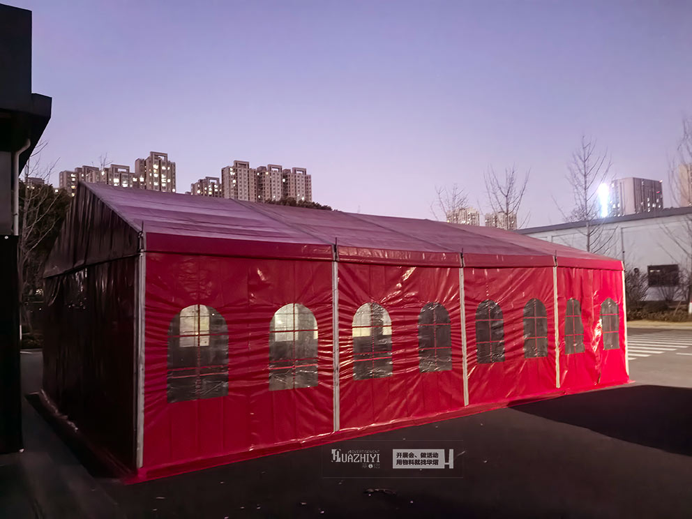 濟源篷房租賃深入洞察年貨節的民俗屬性與消費心理,精選紅色篷布打造核心展示空間。紅色作為新春的經典象征,承載著吉祥喜慶的美好寓意,與年貨節的熱鬧氛圍完美契合,紅色篷房成為年貨節最亮眼的視覺標識,瞬間拉滿年味。篷房采用經典人字形設計,線條流暢大氣,搭配紅色篷布的濃郁色澤,既彰顯傳統年味,又不失規整質感,讓市民在采購過程中沉浸式感受新春的喜慶氛圍。